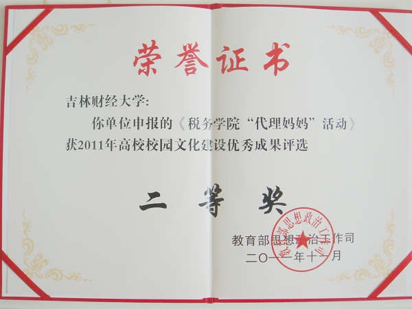 近日,从吉林省教育厅获悉,在教育部思想政治工作司组织开展的2011年全国高校校园文化建设优秀成果评选活动中,由公司报送的《EMC易倍“代理妈妈”活动》荣获“2011年全国高校校园文化建设优秀成果评选二等奖”。