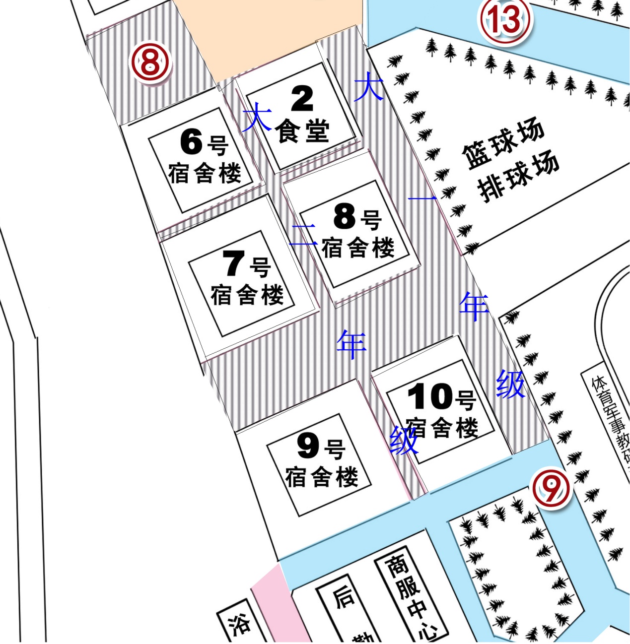 公司扫雪地点主要集中与二食堂至九号寝室楼,如下图: