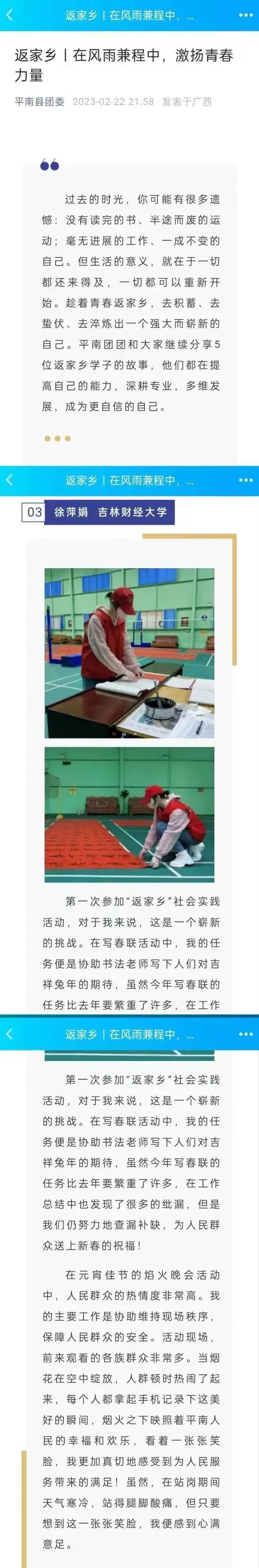“返家乡”社会实践活动是践行社会主义核心价值观的有效途径,是老员工磨练品格、增长才干、实现全面发展的重要舞台。通过社会实践税院员工切身感受了党的领导下过去五年和新时代十年取得的宏伟成就,在服务家乡、服务人民中学思践悟习近平新时代中国特色社会主义思想的世界观、方法论和党的二十大精神,用实际行动在以中国式现代化全面推进中华民族伟大复兴的使命任务中贡献自己的青春力量。祝愿税院学子能在“返家乡”社会实践活动中开阔视野,提升思想,共话青春,将理论转化为能力,将热爱转化为行动,立志做有理想、敢担当、能吃苦、肯奋斗的新时代好青年,让青春在全面建设社会主义现代化国家的火热实践中绽放绚丽之花。