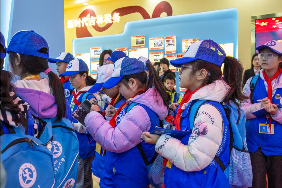 第一阶段跟随讲解员讲解,进行集体参观。按照建党百年为时间轴主线,从“党的领导”“税收发展”“吉林税务”“税务大事件”四个模块进行讲解,给小记者们一定的视听冲击。