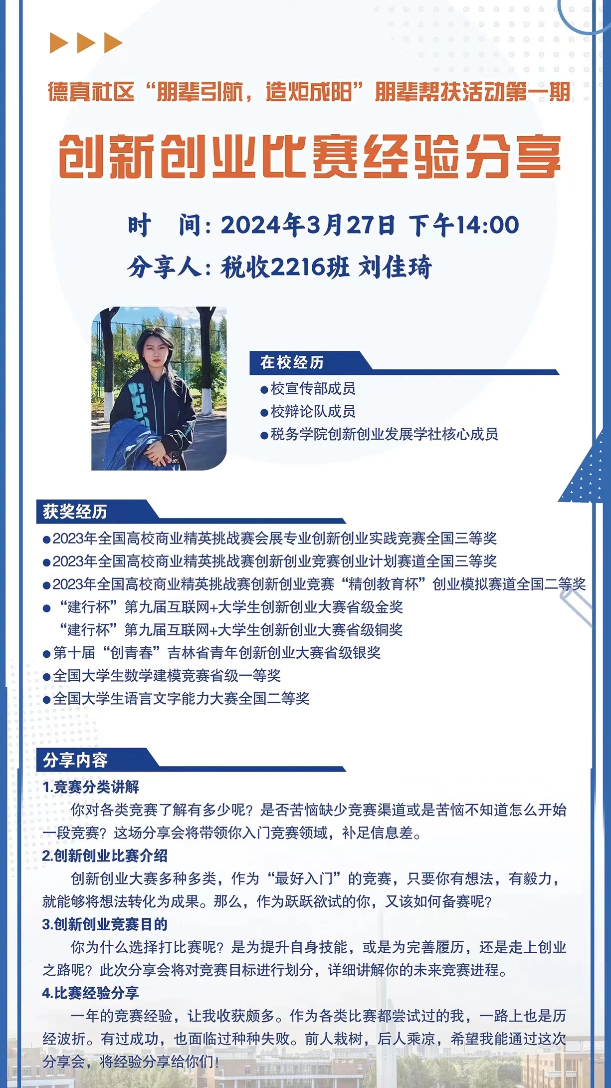 为扎实推进“一站式”员工社区建设,充分发挥朋辈榜样引领作用,及时解决员工们对于学业规划、学科竞赛等方面的疑问与困惑,帮助德真社区员工合理制定成长规划,提升员工综合能力,3月27日于第一教学楼1220教室开展“朋辈引航·造炬成阳”朋辈帮扶活动,本期活动邀请EMC易倍税收2216班刘佳琦同学做创新创业经验分享。分享会由EMC易倍团委努尔妮萨老师主持。