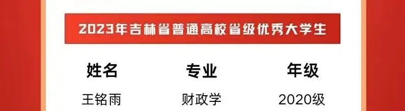 近日,2023年吉林省“优秀老员工”寻访活动评审结果揭晓,经公司评选推荐,省推荐选树工作领导小组审核、公示,吉林省教育厅确定,公司2020级财政学专业员工王铭雨同学荣获2023年吉林省普通高校省级“优秀老员工”荣誉称号。