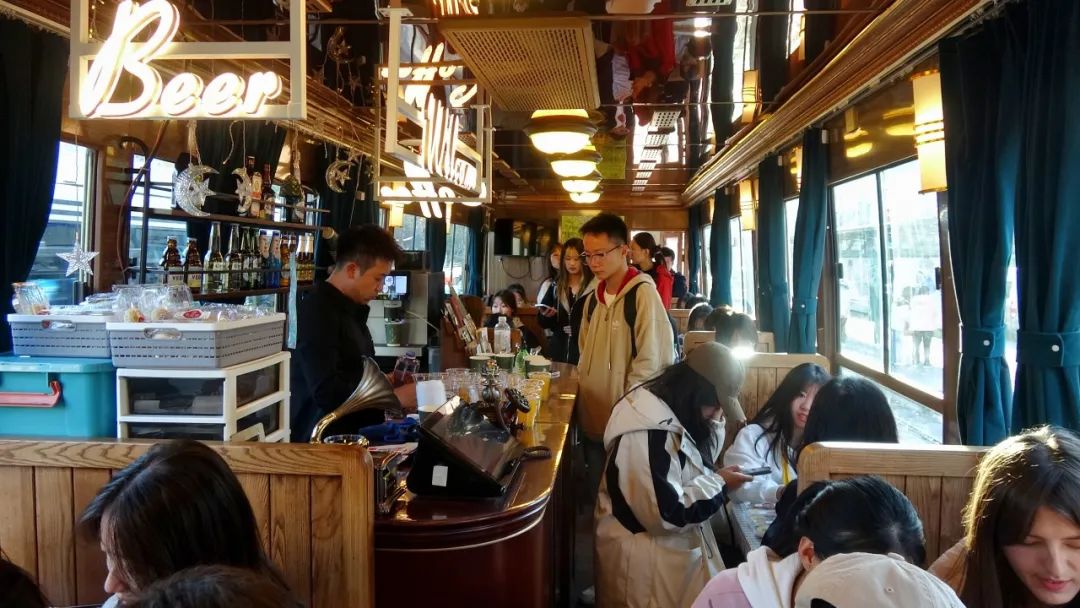 第二站,大家来到了长春公交集团电车公司54路文旅专线摩电咖啡酒吧,电车公司为大家准备了甜品与饮品,同学们听着讲解员对电车文化、文旅专线的讲解、品尝非遗美食、欣赏沿途的风景、感受摩电咖啡酒吧的独特魅力。对于长春公交,“54路”代表的不仅仅是青春,还见证了长春这一城市的历史发展。光阴荏苒,从曾经的伪满国都,到现在的北国春城。时光正如电车的车轮在与轨道的摩擦中滚滚向前。这么多年“54路”传承的不仅仅是长春这一个城市的文化,更是一代人的情怀。一年四季,"54路”的沿途都有着不同的景象。这短短的7.64公里,坐在车内,微风缓缓吹过车窗前的落叶,看着一栋栋高楼和匆忙的人群,体会着当地的风土人情,也是一程惬意的体验。