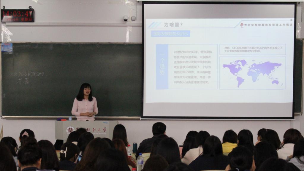 在本学期《大企业税收管理实践》课程分别邀请了辽宁省税务局第一分局(大企业服务和管理局)副局长王镇、东南大学教授虞青松、中汇税务师事务所副总裁,合伙人孙洋、重庆市税务局税收科学研究所副所长张虹、北京市第一税务分局金融团队负责人喻欣欣、北京西城税务局副调研员白玉明、长春市二道区税务局孙静、中国税务报社编辑记者李雨柔,分别讲授 “大企业税收管理理论与实践”、“国际税收事先裁定”、“重组并购的税务风险”、“金融保险业税收风险分析与应对”、“不良资产处置涉税风险管理”、“金融业税制与税收风险管理”、 “大企业税收风险管理”、“大企业税收报道的逻辑”等专题。从税务机关、大企业和中介服务机构的视角,全面展示了国内外大企业税收管理沿革及管理实践创新。