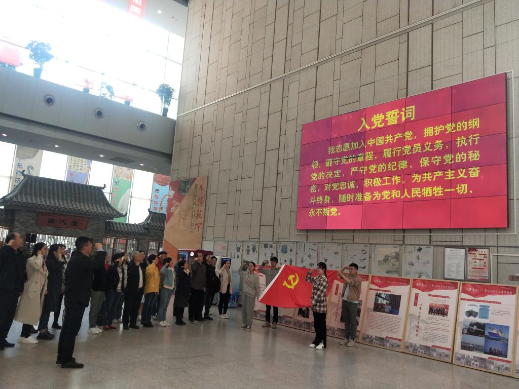 在参观结束后,面对党旗,全体党员师生在党委书记赵彦双的领誓下,一同重温了入党誓词。