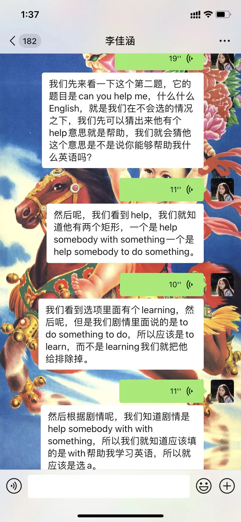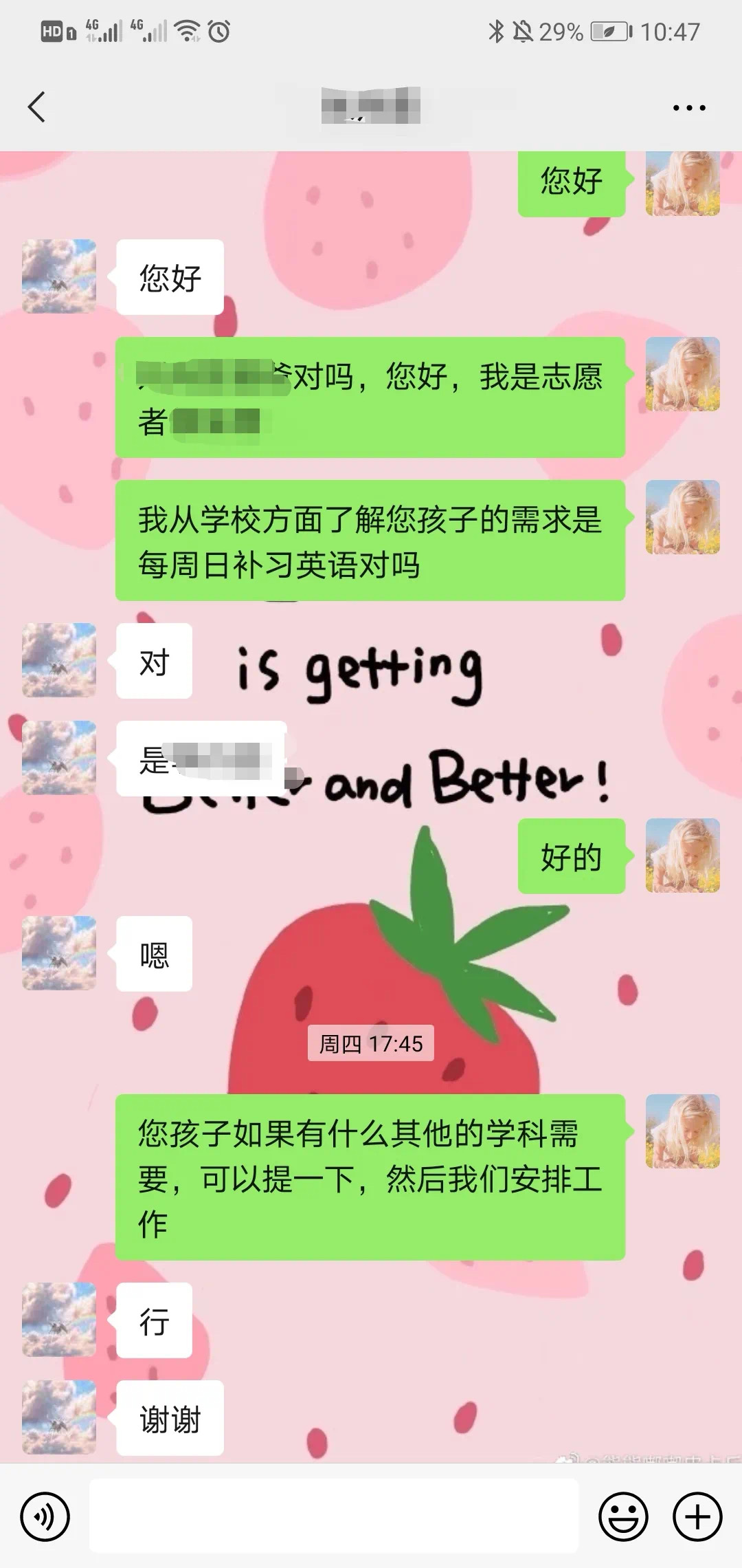 由18级贾婧瑶,19级孙慧琳、陈子婧、汤璐宁和20级王明霞、杜佳颖、陈红、于景轩、姚艺婷、徐一迪负责对接的是秦嘉鑫同学。在收到成为“学伴+”活动志愿者的通知后,作为组长,贾婧瑶同学立即与小组成员沟通,分配工作,力求能尽快帮助秦嘉鑫同学辅导功课。志愿者主要是通过腾讯会议进行辅导,在辅导功课的过程中,秦嘉鑫同学积极发问,志愿者也会耐心地为其解答。为了使辅导效果更好,志愿者还组建起微信群,方便秦嘉鑫同学能够通过微信上传题目图片、与志愿者沟通等。志愿者表示,希望通过这一段时间的辅导,不仅可以帮助秦嘉鑫同学巩固知识,还可以给予其激励,提高她学习的兴趣。