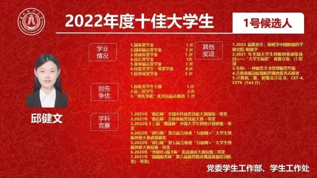 邱健文,是一个有理想、有抱负的新青年,她是时间的“爱人”,她珍爱着生命里的每一分每一秒。因此,在校期间,她多次获得优秀员工一等奖学金,先后获得国家奖学金、吉林省政府奖学金、董事长奖学金、亚泰励志奖学金等奖项,以及优秀员工干部、三好员工、学习标兵单项奖学金等荣誉称号,成功保研至中国财政科学研究院财政学硕。纵使学业繁忙,邱健文仍非常负责任地完成校史馆和班级的各项工作,作为校史馆秘书长,她积极策划活动方案,多次参与校史讲解;作为班级学习委员,她积极投身于班级学风建设,尽职做好老师和同学们之间沟通的桥梁,工作中永远铭记她的责任。